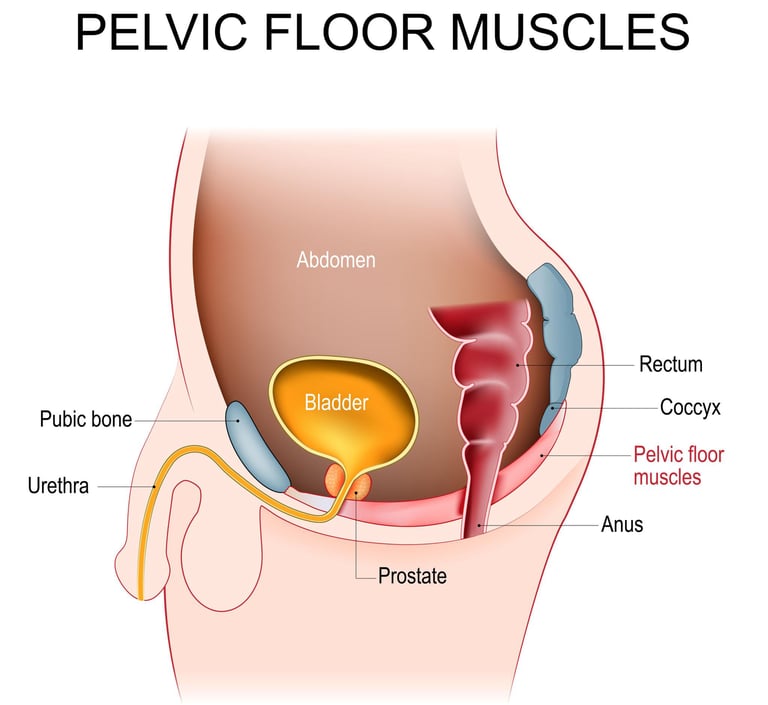The pelvic floor is a group of muscles located at the base of the pelvis. In men, these muscles stretch like a hammock from the pubic bone (front) to the tailbone (back).