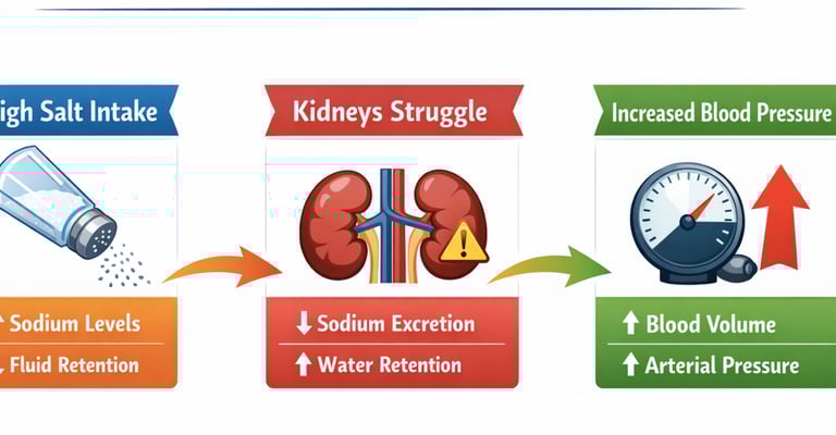 More sodium → more water retained → higher blood volume.Higher blood volume = higher pressure